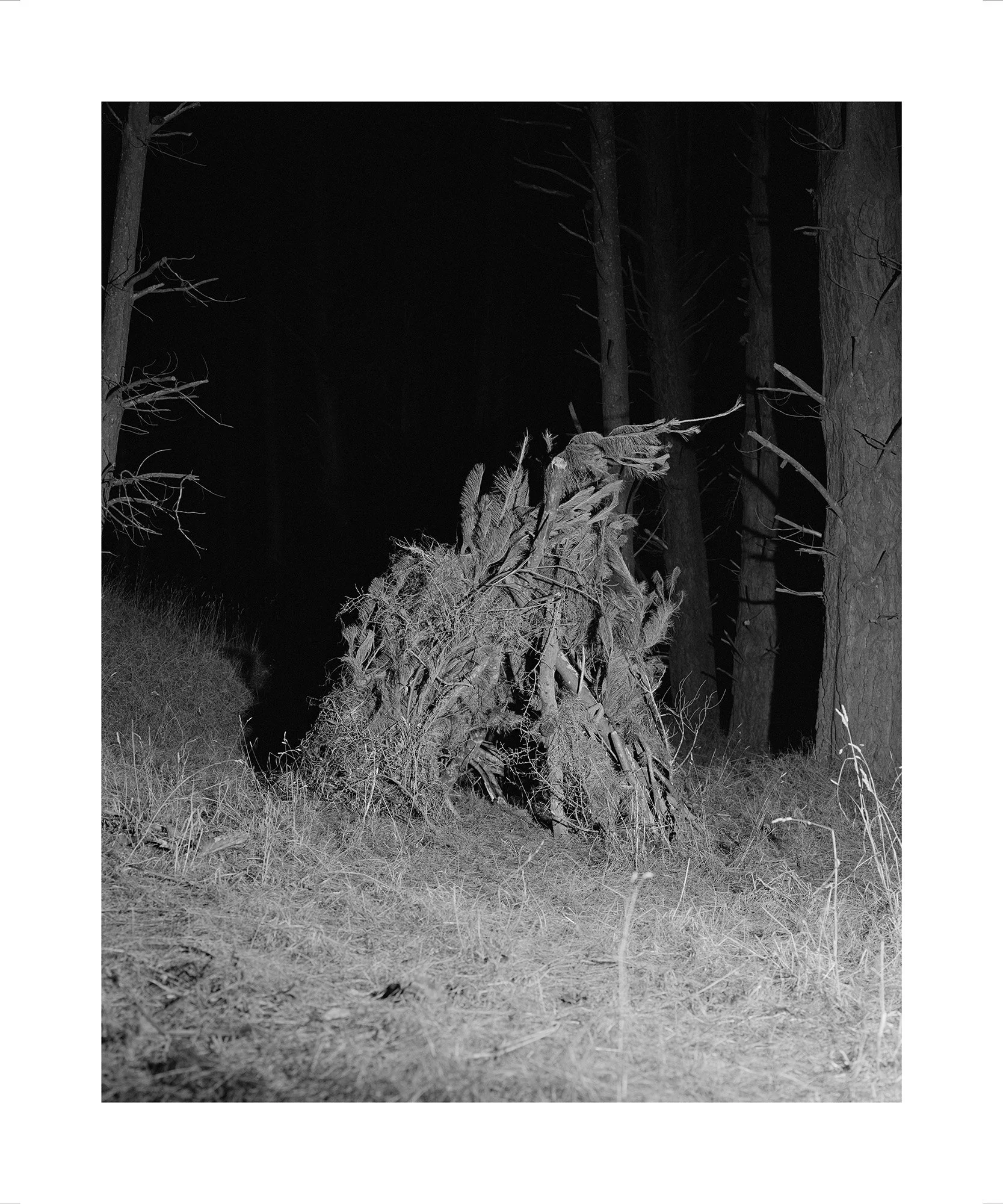 Hut (They Say They Live Here) is a scene constructed of pine, bracken and gorse, resulting as an amalgamation of two distinct but equally important practices, my art practice and my desire to play in forests . Utilising the pine forest landscape so often seen bordering rural towns of the Central North Island, there are inherent connotations to a haunted post colonial land tied to this scene. Once fertile soil, now acidic and stripped of its native flora hosts a ghoulish tree hut, elevating the discarded borderlands of small towns into something otherworldly.