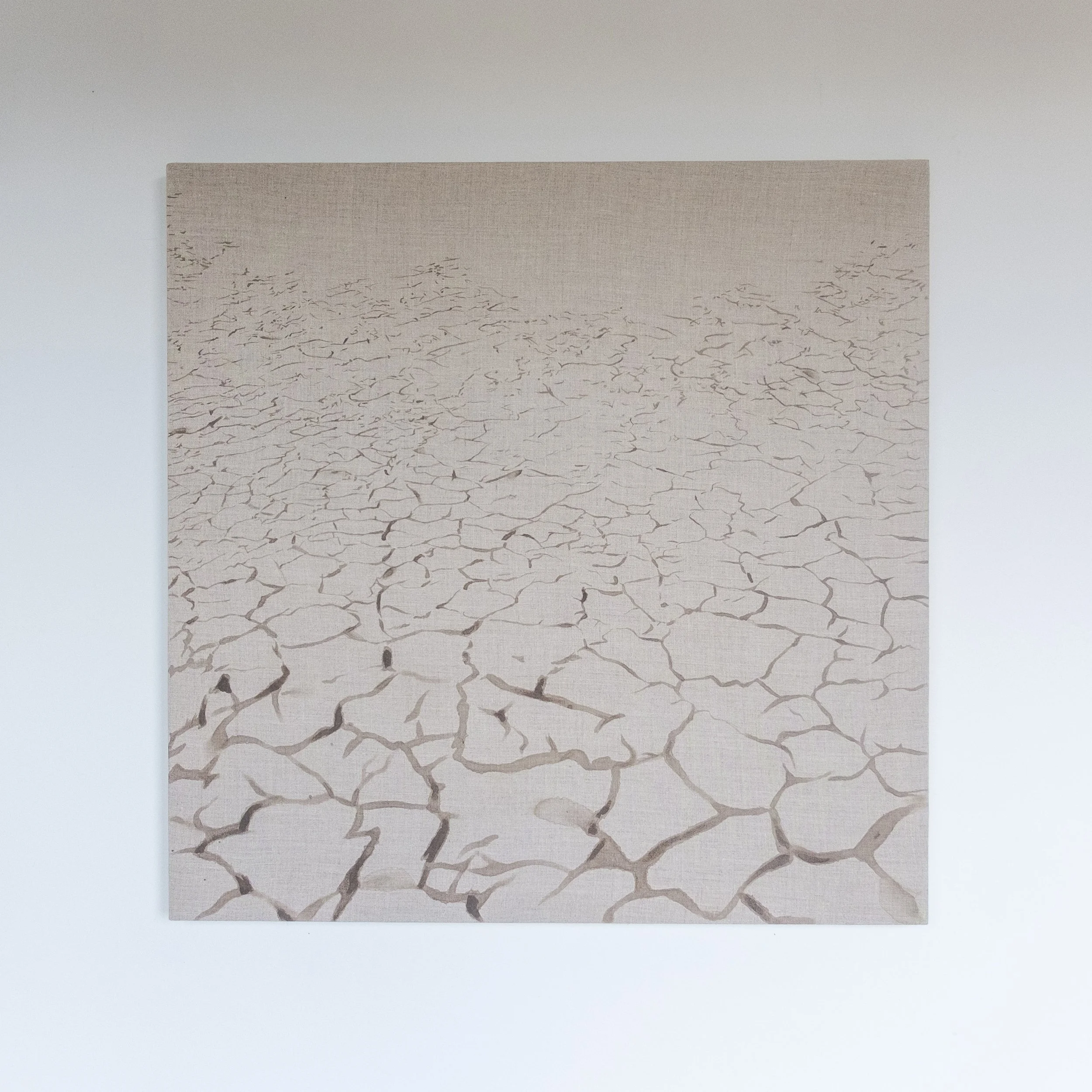 Parched and weary, she wells up shows cracked earth spreading across the canvas in an intricate web. This work emerged from a poem written during a year-long project with Boggy Pond, one of the repo/wetlands bordering Wairarapa Moana. Together, the painting and poem reflect on the interconnected, layered life of wetlands — and on the ways these “wild” spaces have been drained, divided, and controlled in Aotearoa. This includes both historic and ongoing flooding caused by colonial land practices. Despite this, the work gestures toward restoration and resilience. The watercolour pigment is made from the wetland’s own mud, inviting Boggy Pond to act as a collaborator in my making. In doing so, it acknowledges the repo’s agency and wildness, and calls for more reciprocal approaches to conservation and care.